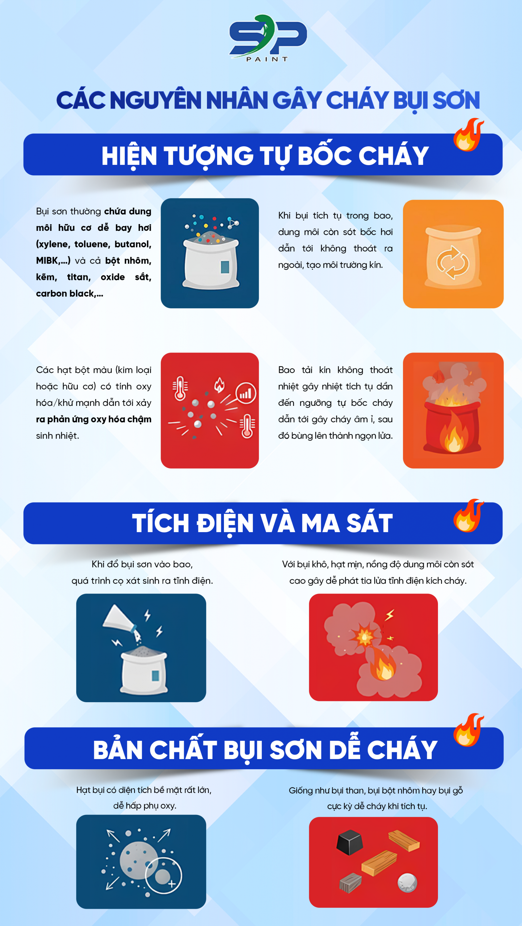 Bụi sơn là một trong những nguy cơ cháy nổ ít được chú ý nhưng có tính nguy hiểm cao trong nhà máy sản xuất sơn, kho chứa nguyên liệu, và các xưởng gia công. Bài viết này giải thích rõ những nguyên nhân chính khiến bụi sơn dễ gây cháy, giúp bạn nhận diện rủi ro và có hành động phòng ngừa phù hợp.